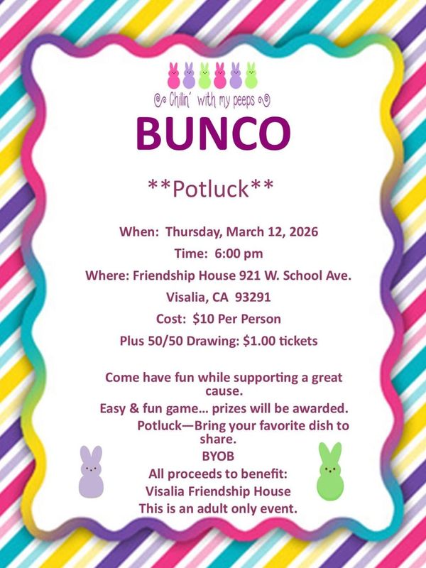 Come have fun playing Bunco and support The Visalia Friendship House! $10 donation to play with a chance to win prizes. Plus, enter to play the 50/50 raffle at $1 per ticket. Bring a dish, snack or dessert to share.