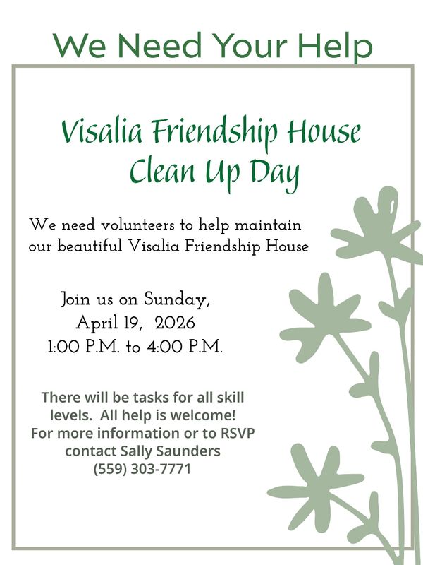 Volunteers needed to help maintain our beautiful Visalia Friendship House. There will be tasks for all skill levels. All help is welcome!